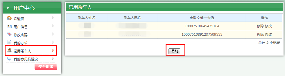 为简化预订流程,减少用户输入环节,定制公交平台在“用户中心”中增加了对常用乘车人信息的维护,可对常用乘车人信息进行增、删、改操作。