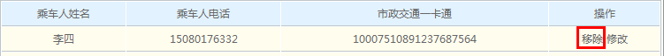 点击拟删除乘车人“操作”列下的“移除”(图五红框处)即可。