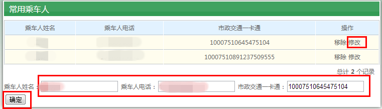 点击拟修改乘车人“操作”列下的“修改”(图六红框处),并在相应文本框内录入修改后的常用乘车人信息,再点击“确定”按钮即可。