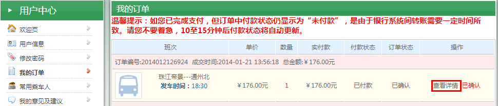 (1)在“我的订单”中选择需更换一卡通卡号的订单,点击“查看详情”(图七红框处)。