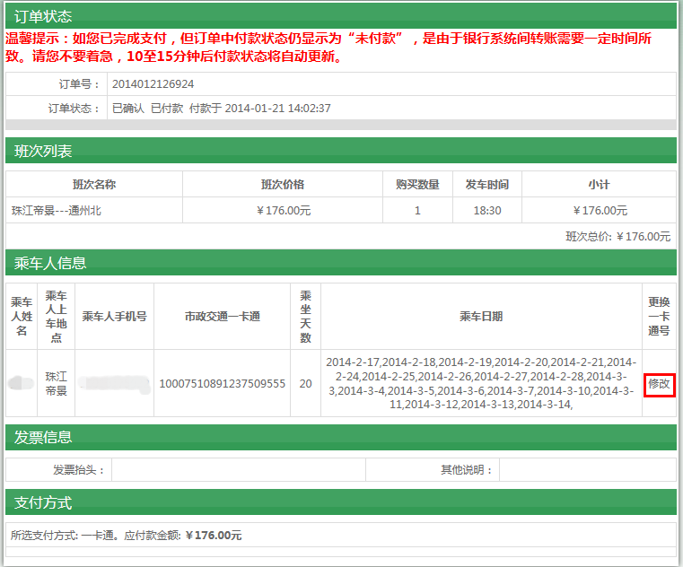 若发现卡号录入错误、一卡通丢失或余额不足,需在订单中及时维护一卡通卡号,否则将无法继续乘车。每日22:00前可修改卡号,新卡号自更新次日起生效。具体方法为: