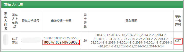 在订单提交过程中,在图二红框所示位置,除填写乘客姓名、手机号码、上车地点外,还需填写乘客乘车时所使用的市政交通一卡通卡号。也可点击左侧的“选择”按钮,从“常用乘车人”中选择乘车人信息。“常用乘车人”的维护方法详见第3条。