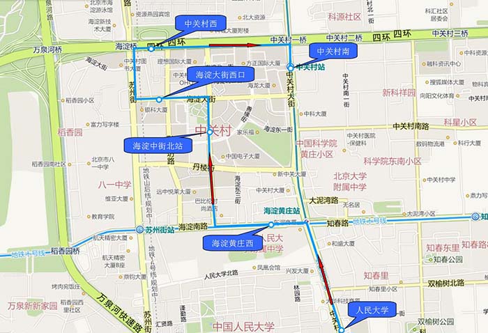 1.人民大学 2.海淀黄庄西 3.海淀中街北站 4.海淀大街西口 5.中关村西 6.中关村南 |