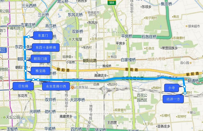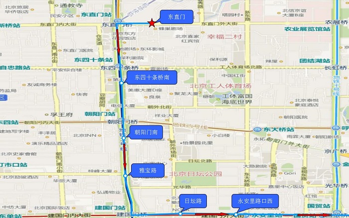 | 2020-5-8 | 18:10 | 60分钟 | 1.东直门 2.东四十条桥南 3.朝阳门南 4.雅宝路 5.日坛路 6.永安里路口西 |