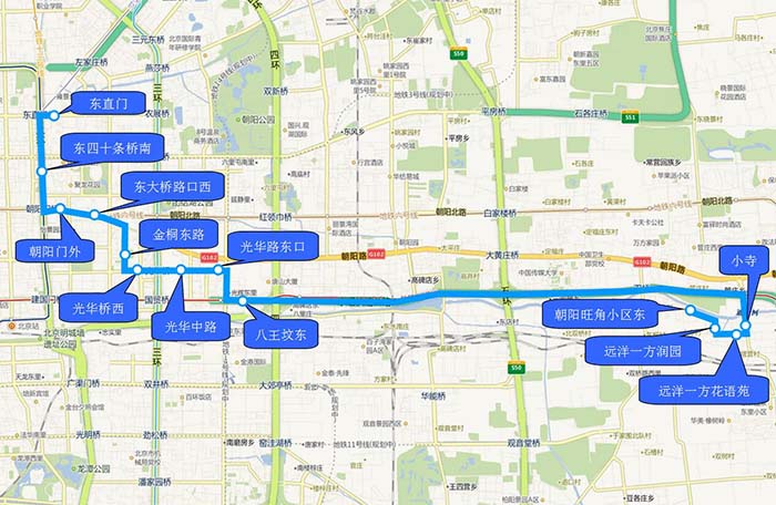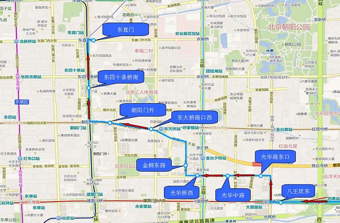 1.八王坟东 2.光华路东口 3.光华中路 4.光华桥西 5.金桐东路 6.东大桥路口西 7.朝阳门外 8.东四十条桥南 9.东直门 |