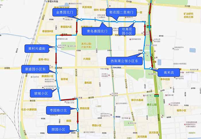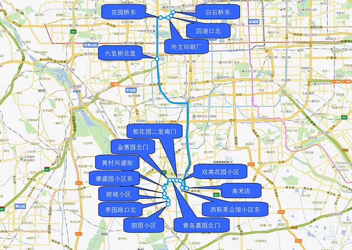 1.高米店 2.西斯莱公馆小区东 3.双高花园小区 4.郁花园二里南门 5.青岛嘉园北门 6.金惠园北门 7.黄村兴盛街 8.康盛园小区东 9.骏城小区 10.枣园路口北 11.丽园路口南 |