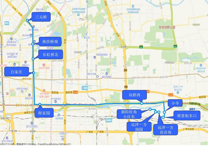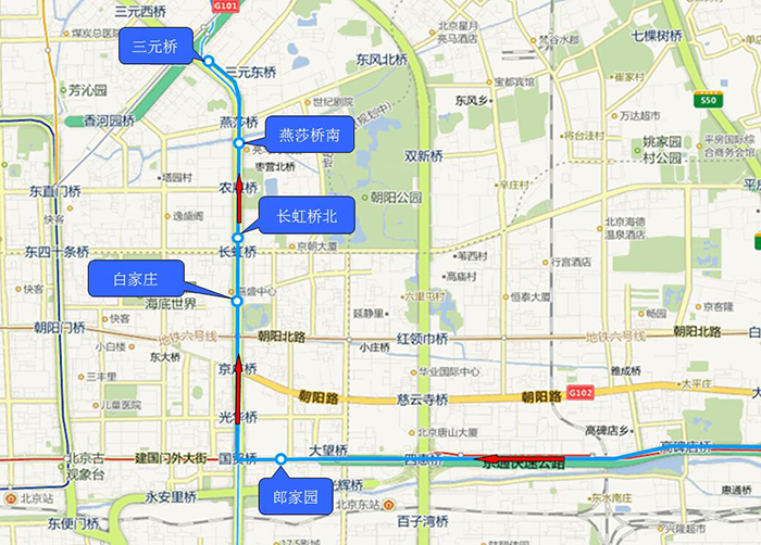 1.郎家园 2.白家庄 3.长虹桥北 4.燕莎桥南 5.三元桥 |