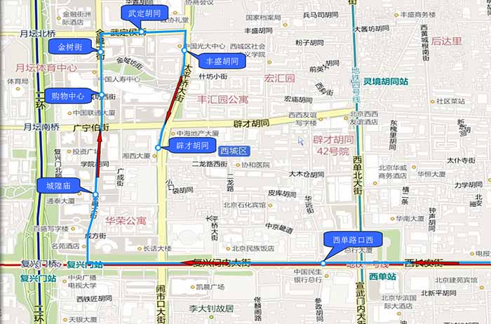 1.西单路口西 2.城隍庙 3.购物中心 4.金树街 5.武定胡同 6.丰盛胡同 7.辟才胡同 |