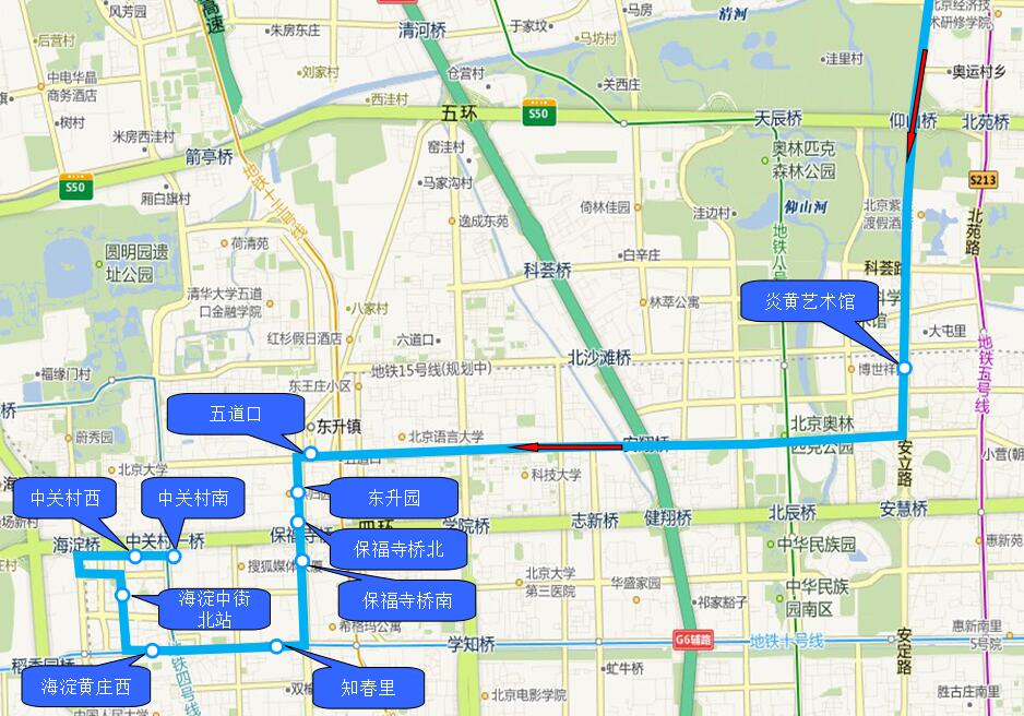 1.炎黄艺术馆 2.五道口 3.东升园 4.保福寺桥北 5.保福寺桥南 6.知春里 7.海淀黄庄西 8.海淀中街北站 9.中关村西 10.中关村南 |