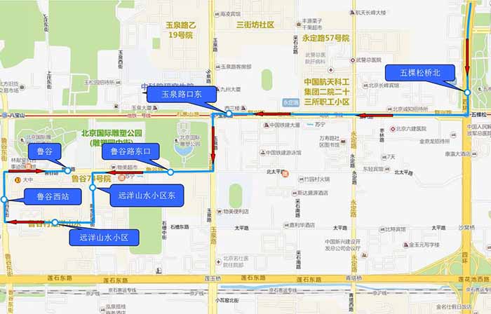 1.五棵松桥北 2.玉泉路口东 3.鲁谷路东口 4.远洋山水小区东 5.远洋山水小区 6.鲁谷西站 7.鲁谷 |