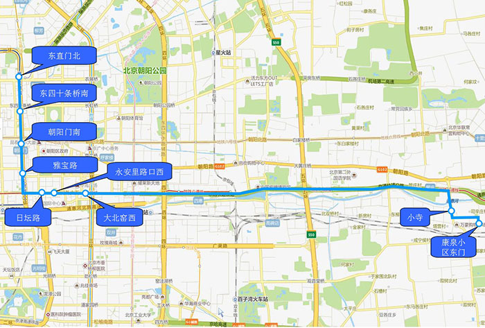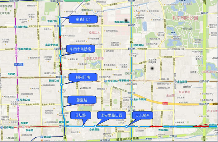 1.大北窑西 2.永安里路口西 3.日坛路 4.雅宝路 5.朝阳门南 6.东四十条桥南 7.东直门北 |