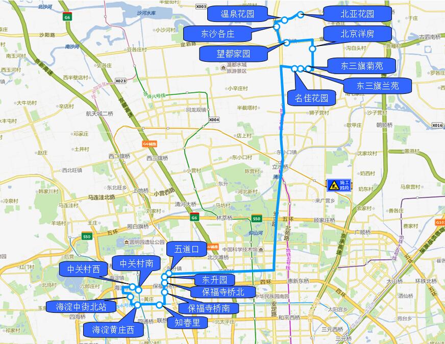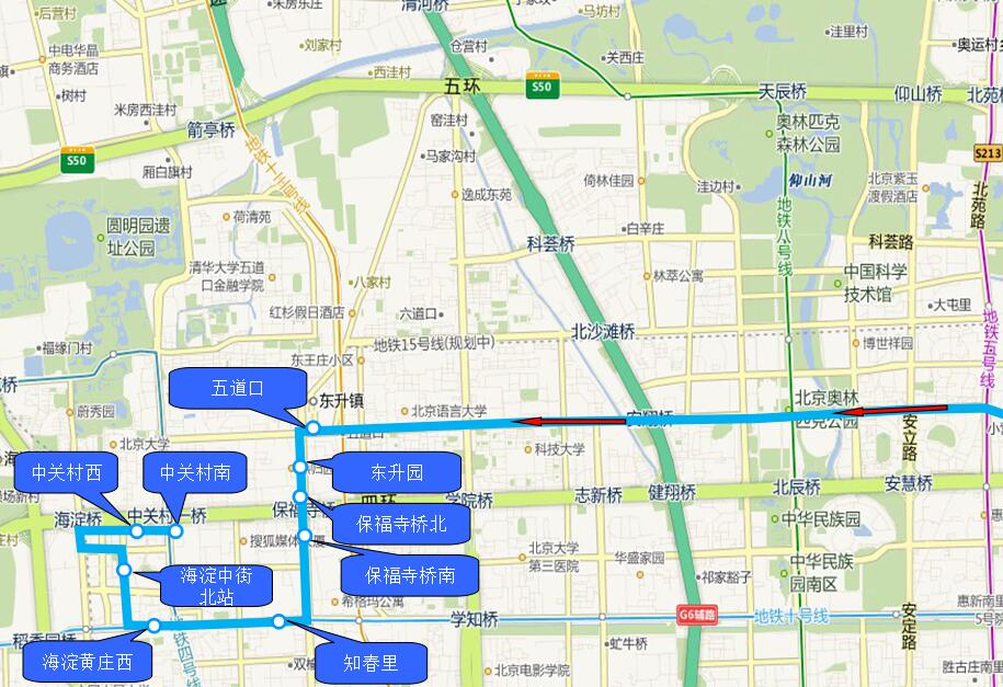 1.五道口 2.东升园 3.保福寺桥北 4.保福寺桥南 5.知春里 6.海淀黄庄西 7.海淀中街北站 8.中关村西 9.中关村南 |