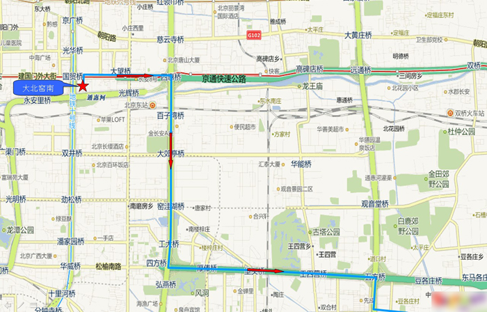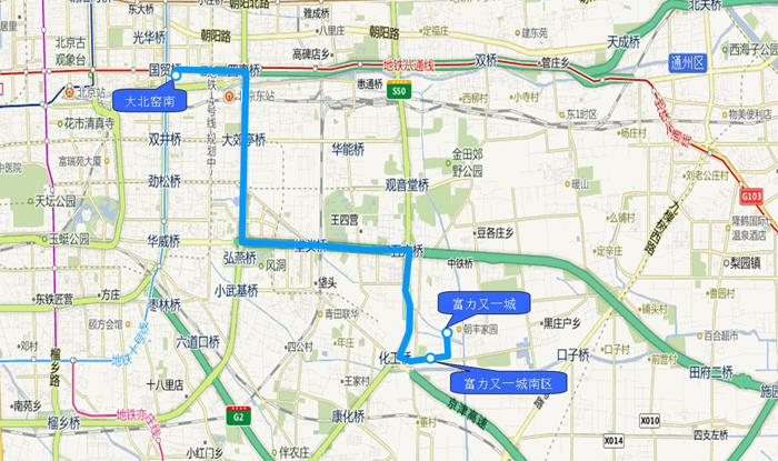 发车时间 18:25 到达时间 19:15 出发城区 朝阳区 到达城区 朝阳区 出发商圈 国贸 到达商圈 豆各庄 出发地点 大北窑南 到达地点 富力又一城 上车地点 1.大北窑南 下车地点 1.富力又一城南区
