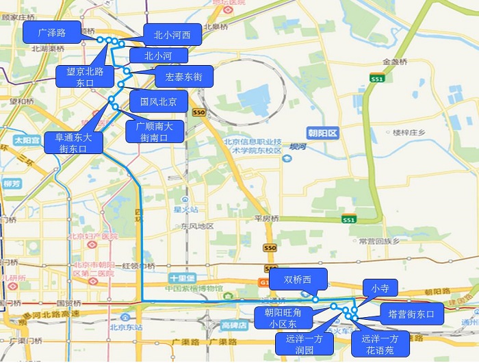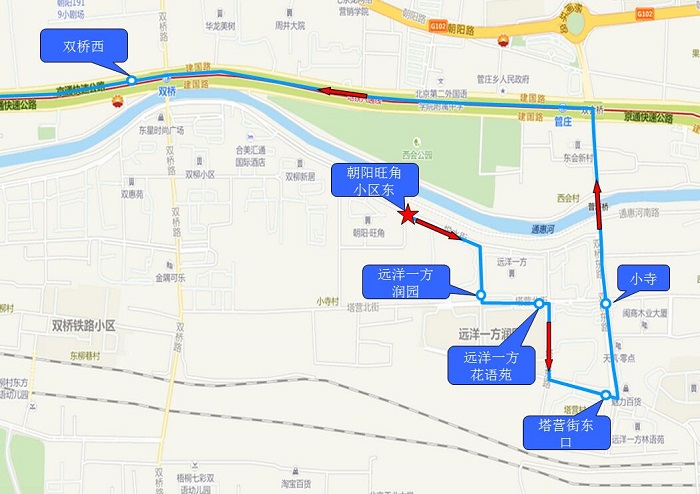 | 2020-5-25 | 7:40 | 60分钟 | 1.朝阳旺角小区东 2.远洋一方润园 3.远洋一方花语苑 4.塔营街东口 5.小寺 6.双桥西 |