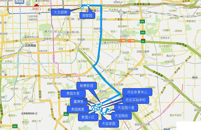 1.新康家园 2.贵园东里 3.富源里 4.贵园南里 5.贵园小区 6.亦庄体育中心 7.亦庄实验学校 8.天宝家园 9.天宝南街 10.天宝园六里 |