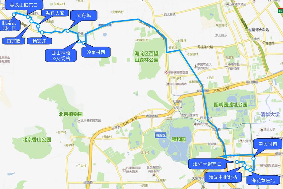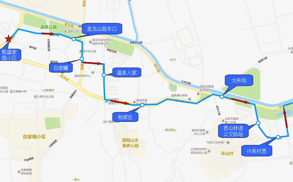 | 2020-5-25 | 7:15 | 75分钟 | 1.凯盛家园小区 2.显龙山路东口 3.白家疃 4.温泉人家 5.杨家庄 6.太舟坞 7.西山林语公交场站 8.冷泉村西 |