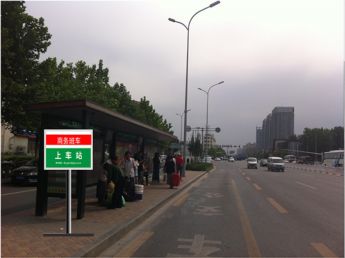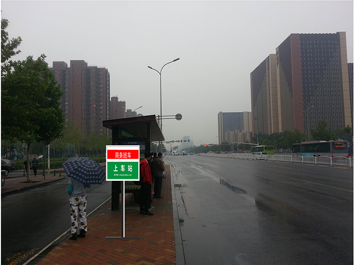 A:商务班车在明显位置设置标识,方便乘客识别和乘坐。请您提前在上车站点候车,上车站点的具体位置详见“班车介绍”,班车将按时到站。