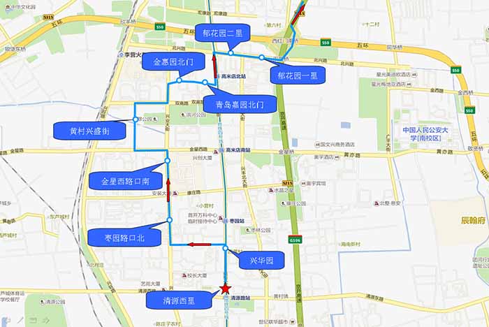 | 2020-5-27 | 7:10 | 90分钟 | 1.清源西里 2.兴花园 3.枣园路口北 4.金星西路口南 5.黄村兴盛街 6.金惠园北门 7.青岛嘉园北门 8.郁花园二里 9.郁花园一里 |