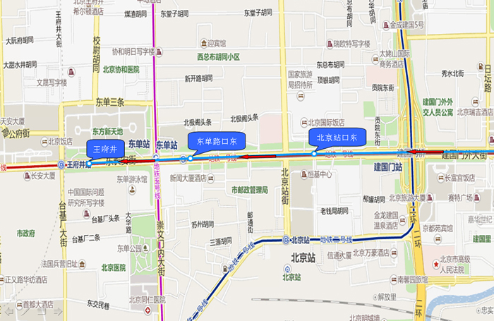 1.北京站口东 2.东单路口东 3.王府井 |