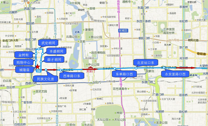 | 2020-6-1 | 18:10 | 60分钟 | 1.城隍庙 2.购物中心 3.金树街 4.武定胡同 5.丰盛胡同 6.辟才胡同 7.民族文化宫 8.西单路口东 9.东单路口西 10.北京站口东 11.永安里路口西 |