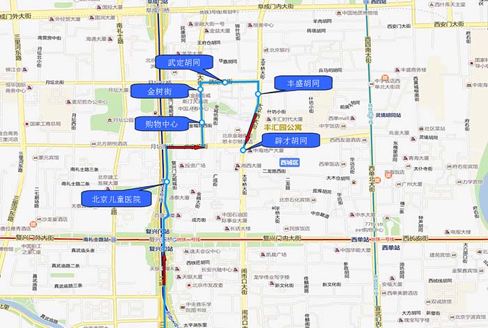 1.北京儿童医院 2.购物中心 3.金树街 4.武定胡同 5.丰盛胡同 6.辟才胡同 |